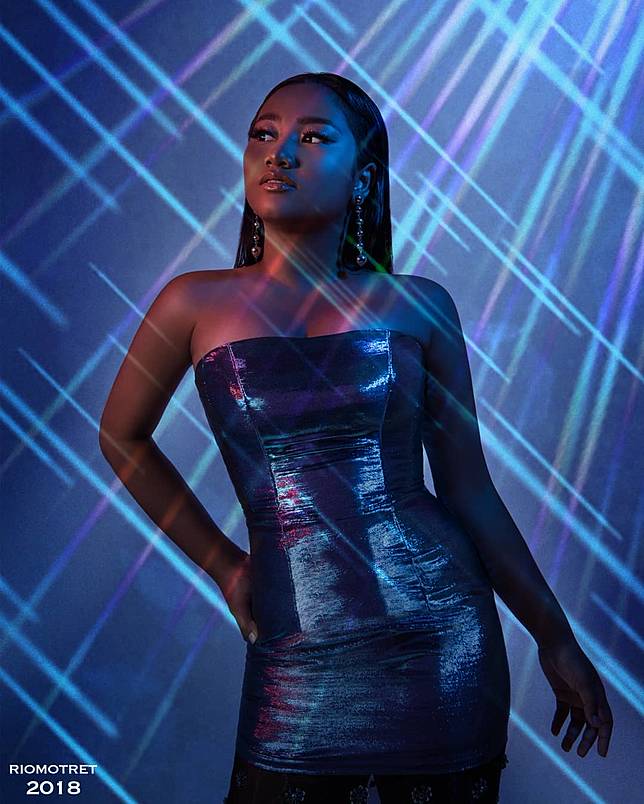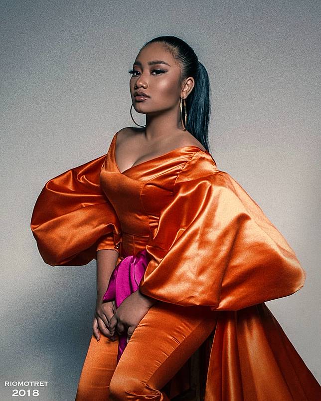 3. Maria memperlihatkan bahunya yang eksotis dengan outfit unik berwarna orange, tak lupa ponytail bak Ariana Grande